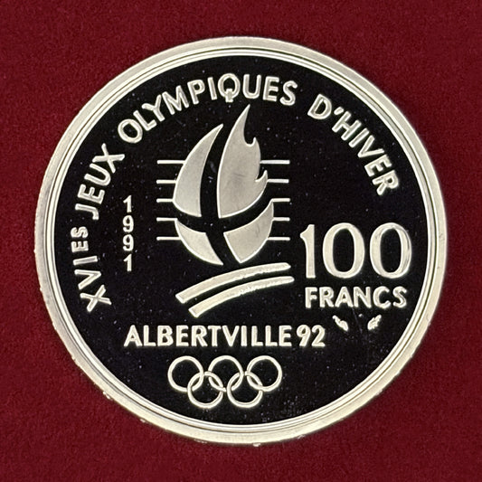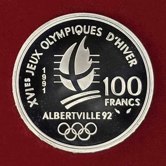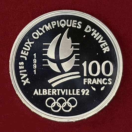 NEW 【フランス】1992年アルベールビルオリンピック記念 100フラン 銀貨 スキースラローム プルーフ 1990[B-0000749]